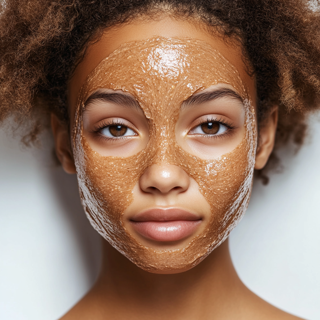 Using clean fingers or a soft brush, apply a thin layer of GlamourMask to your face. Avoid the eyes and mouth.